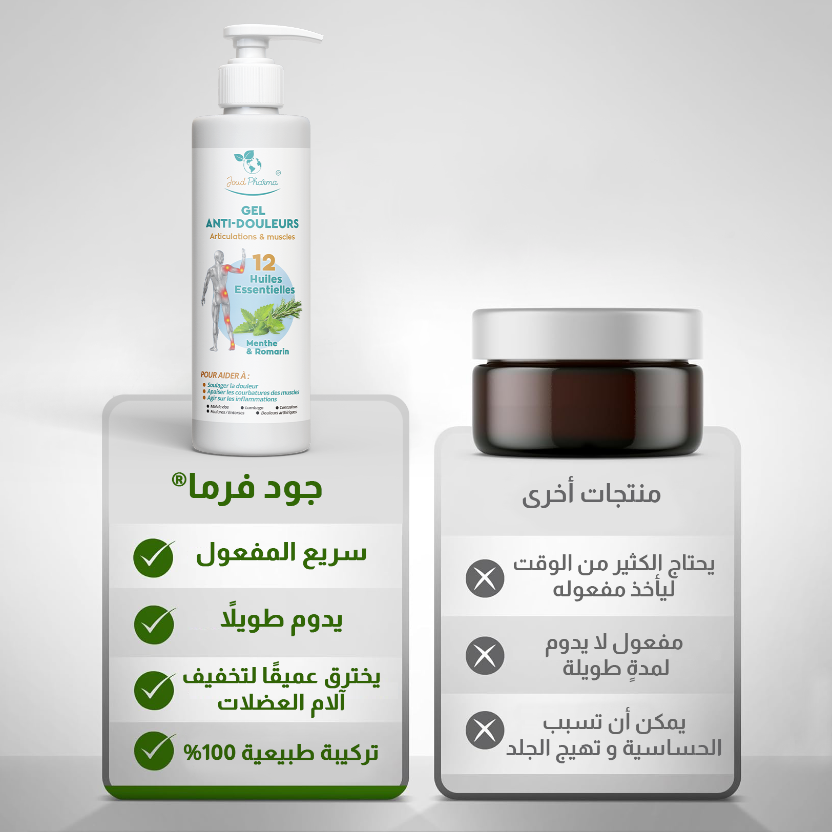 "كنصيحة طبية، ننصح باستعمال جل مضاد للآلام من جود فارما كحل فعّال وسريع لتخفيف الآلام العضلية والمفصلية. المنتج هذا يتميّز بتركيبته المتطورة اللي تخفف الالتهاب وتساعد على تحسين الحركة اليومية. بالنسبة للمرضى اللي يعانيو من أوجاع يومية في العضلات والمفاصل، الجل هذا يوفر راحة واضحة ونتائج سريعة. ننصح باستعماله بانتظام حسب التعليمات المكتوبة على العبوة